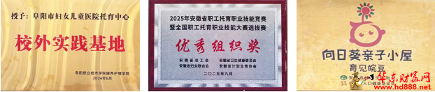 一份耕耘,一份收获。近年来,阜阳市妇女儿童医院托育中心凭借在医育结合领域的扎实实践、优质高效的托育服务与突出的工作成效,赢得了社会各界的广泛认可与赞誉,先后斩获“医育结合托育实践基地优秀项目”、“全国爱心托育用人单位”、“省级工会女工家园示范点”等多项荣誉。 这些荣誉,是肯定,更是激励。未来,阜阳市妇女儿童医院托育中心将继续坚守初心、深耕细作,不断优化服务流程、提升服务质量,持续深化医育融合特色,整合优质资源,为更多家庭提供便捷、优质、普惠的托育服务,让每一位0—3岁婴幼儿都能在专业、温暖、安全的环境中茁壮成长,绽放属于自己的光芒。 致敬每一位默默奉献的托育老师,喝彩阜阳市妇女儿童医院托育中心的责任与担当,愿每一份童真都能被温柔守护,每一个孩子都能拥有美好的童年开端! 信息来源 | 杨卉