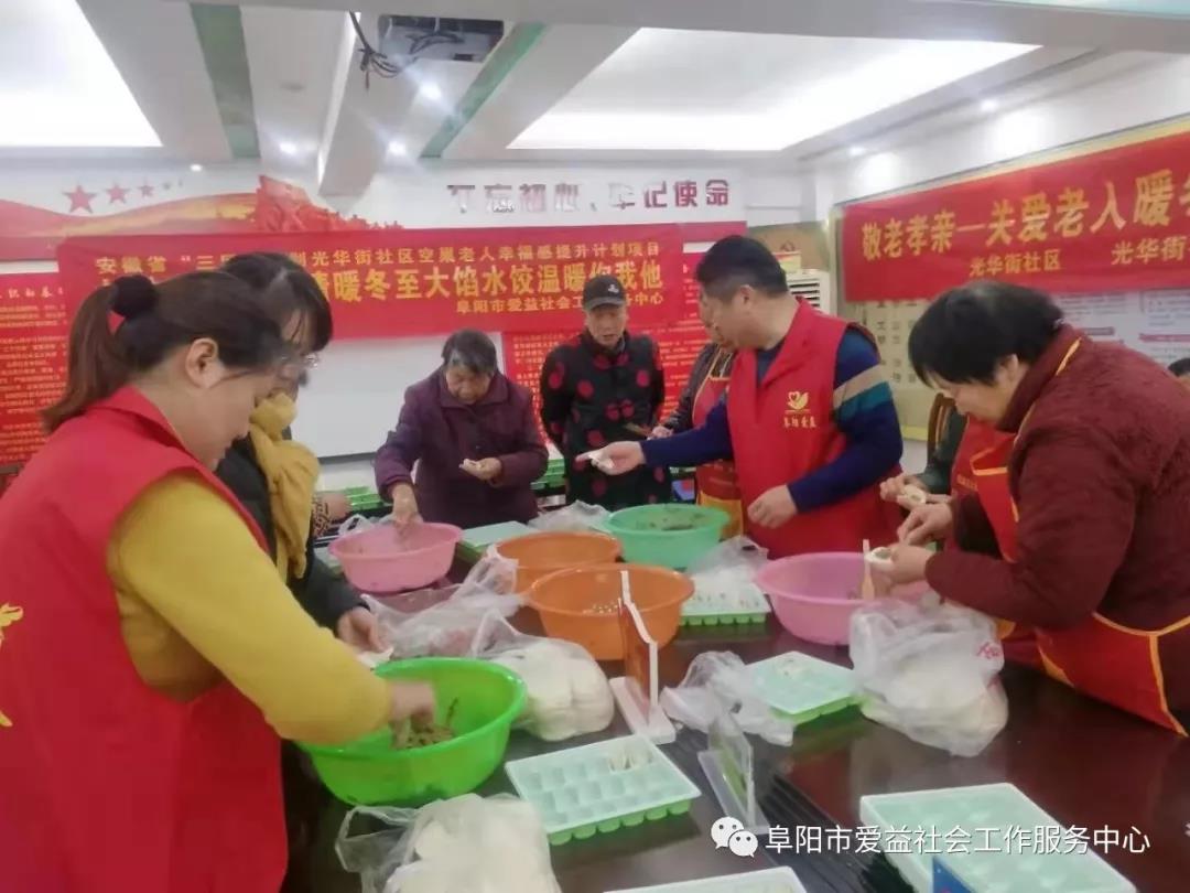 本站阜阳讯(李文标)近日。爱益社工提前两天,安排在星期五的下午,在光华街社区会议室举办了包饺子送老人温暖你我他活动。