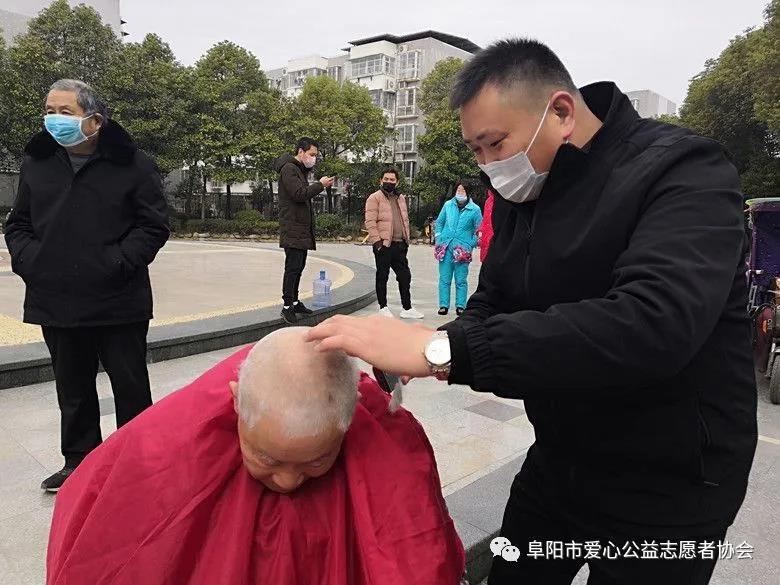 本站阜阳讯(王怀东)3月2日早上不到8点,王杰联合申寨社区书记赵刚和物业携手搞的战瘟疫,献爱心,在丽晶佳苑小区的东门广场为业主免费理发活动。