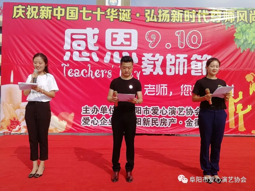 阜阳市爱心演艺协会主持人胡伟、徐诺、梁金燕首先介绍了本次感恩教师节的活动意义、表达了对辛苦付出,默默耕耘老师们的崇高敬意,同时带领现场所有学生、家长、志愿者一千多人,向老师发出响彻天空,感恩洪亮暖心的声音:“老师,您辛苦了”!