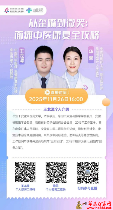 从歪嘴到微笑:面瘫中医康复全攻略 日期:2025-11-26 15:53:22 浏览: 次 突如其来的口角歪斜、眼睛难以闭合……一觉醒来,镜中的自己仿佛变了模样,这突如其来的“面子”问题,是否让您措手不及、焦虑万分?面瘫,并非“绝境”!中医认为,此症多由脉络空虚,风寒或风热之邪乘虚侵袭所致。抓住黄金恢复期,用对康复方法,至关重要!⏰ 11月26日下午16点,🏥 阜阳市妇女儿童医院健康直播间特邀中医科中医师 王龙潭 & 副主任护师 华翠带来【面瘫中医康复全攻略】带您全面解锁中医应对面瘫的“组合拳”,为您扫除疑虑,重拾自信微笑! 赞 0 赏 分享 支付宝转账赞助 支付宝扫一扫赞助 微信转账赞助 微信扫一扫赞助